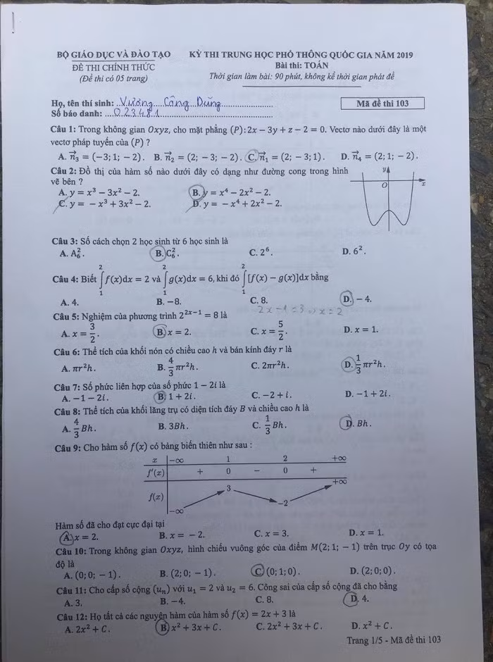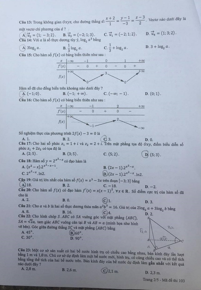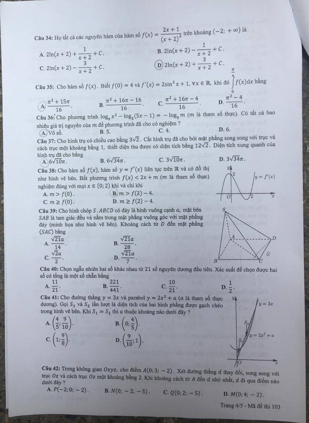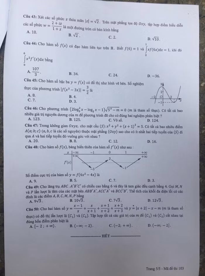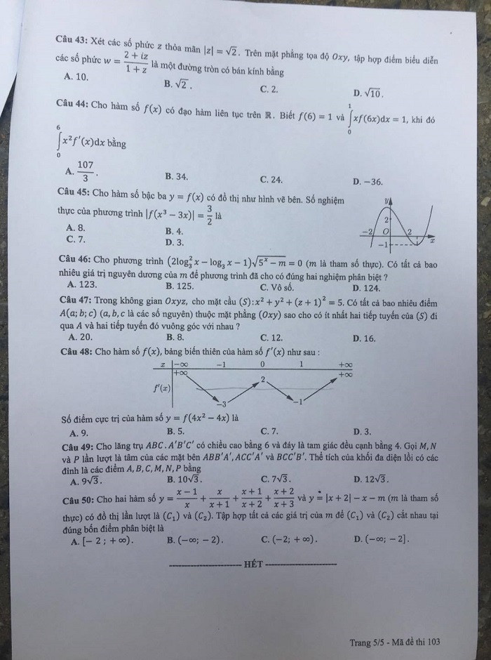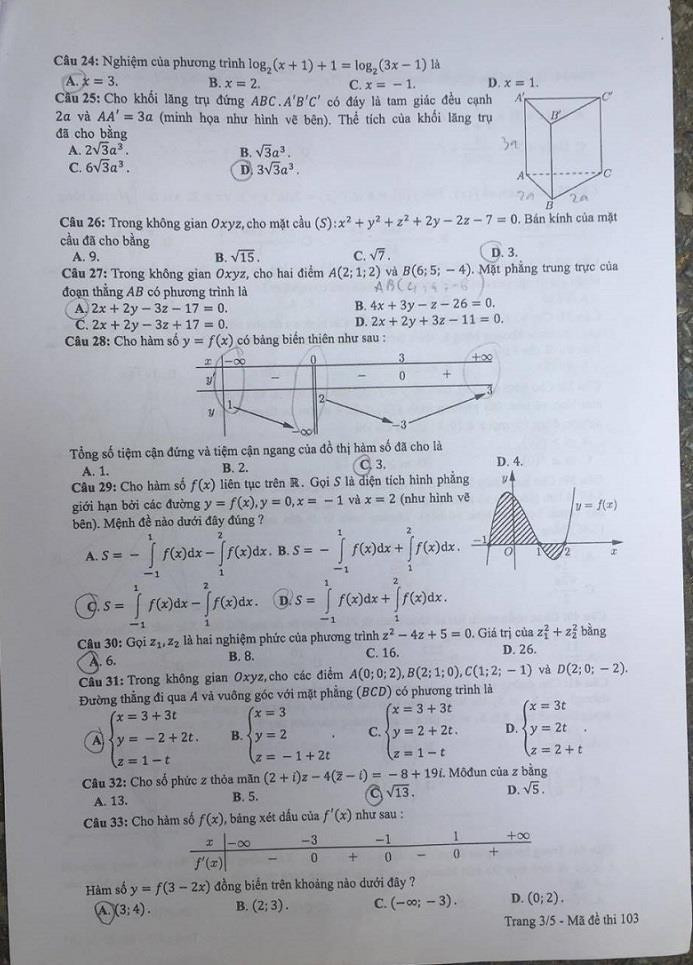 Sau đây là mã đề 103 của đề thi môn Toán, Báo Điện tử Giáo dục Việt Nam gửi tới độc giả. Gợi ý đáp án của các mã đề thi môn Toán, tòa soạn sẽ cập nhật ở những tin sau.
