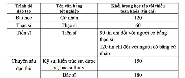Cụ thể, theo dự thảo, khối lượng học tập đối với từng trình độ giáo dục đại học như sau: