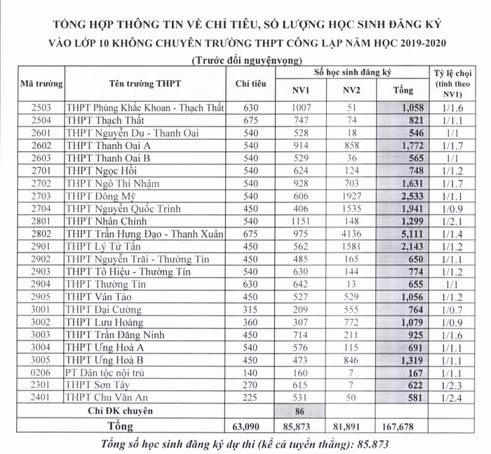 Sở Giáo dục và Đào tạo Hà Nội đã công bố có kết quả thống kê về tỉ lệ chọi vào lớp 10 các trường trung học phổ thông công lập trên toàn địa bàn.
