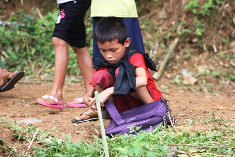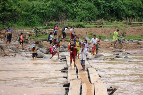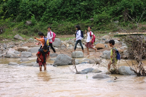 Tuy nhiên, vào mùa mưa, nước lũ dâng cao, cầu tạm bị cuốn trôi, phụ huynh và giáo viên vẫn phải thay nhau dìu dắt các em qua suối để đảm bảo an toàn tính mạng cho học sinh khi đến trường.