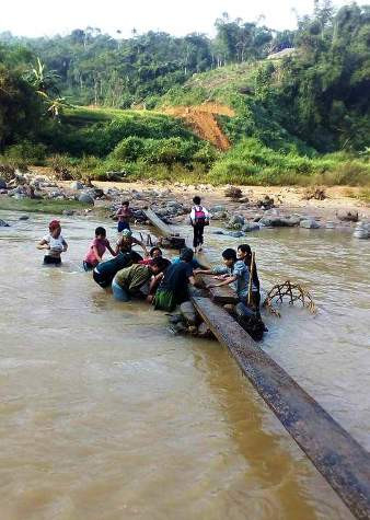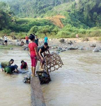 | Mỗi khi nước lũ dâng cao, cầu tạm bị cuốn trôi, dân bản và giáo viên phải lội suối để sửa cầu. Ảnh tư liệu do giáo viên cung cấp. |