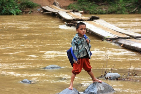 | Mỗi khi có mưa lũ, nước suối dâng cao tới mặt cầu, đe dọa tính mạng của học sinh bản Vịn. Ảnh: Xuân Quang. |