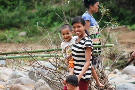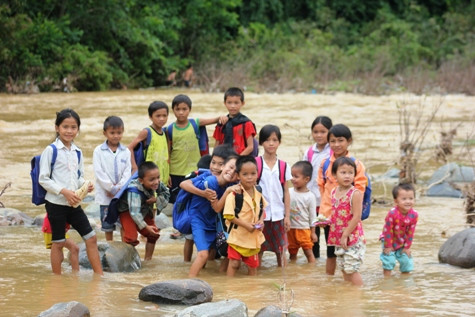 | Phụ huynh bồng bế con qua suối. Họ đang cố gắng để các con không bị thất học. Ảnh: Xuân Quang. |