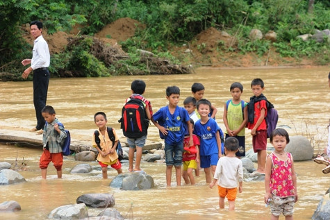 | Hàng chục đứa trẻ di chuyển qua cây cầu tạm do dân bản làm, bên dưới là dòng nước cuồn cuộn chảy xiết. Ảnh Xuân Quang. |