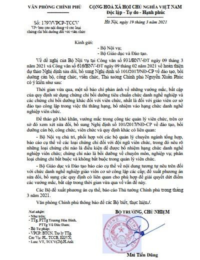 Ngày 19/3, Bộ trưởng, Chủ nhiệm Văn phòng Chính phủ Mai Tiến Dũng ký văn bản gửi Bộ Nội vụ, Bộ Giáo dục và Đào tạo về việc báo cáo nội dung liên quan đến các loại chứng chỉ bồi dưỡng đối với viên chức.