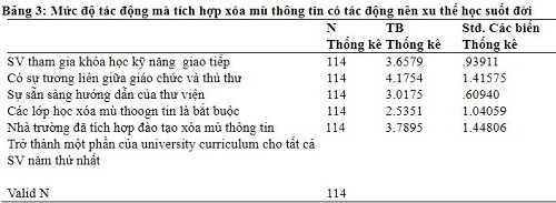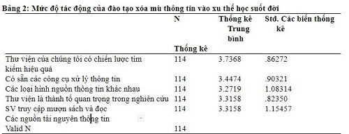 Từ những phát hiện này, chúng tôi kết luận rằng việc học tập suốt đời, đào tạo xóa mù kỹ năng thư viện, tích hợp các kỹ năng xóa mù thông tin vào chương trình đào tạo và định hướng thư viện được liên kết chặt chẽ.