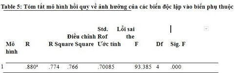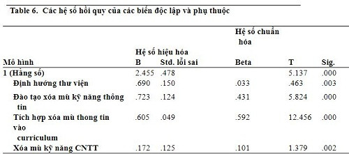 Từ kết quả trong bảng 5, Hệ số xác định nhiều (R2) là 0,774 ngụ ý rằng đường hồi quy là “độ tốt cao của sự phù hợp” giải thích tới 77,4% sự thay đổi trong xu hướng học tập suốt đời. Giá trị p là 0,000 cho thấy mối quan hệ giữa thực tiễn xóa mù thông tin với xu hướng học tập suốt đời của sinh viên đại học có ý nghĩa thống kê ở mức độ tin cậy 5%.
