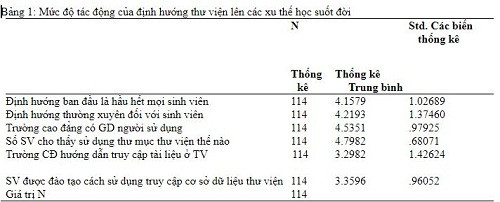 Theo những phát hiện trong Bảng 1, hiệu quả quan trọng nhất của định hướng thư viện đối với xu hướng học tập suốt đời của sinh viên đại học là sinh viên được thể hiện cách sử dụng danh mục thư viện với giá trị trung bình 4.7982, theo sau là yếu tố chỉ ra rằng trường college có trình độ học vấn 4.5351 rằng những người tham gia đã đồng ý với khía cạnh này.