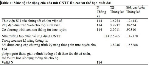 Những kết quả nghiên cứu này phù hợp với Corall (2008), người cho rằng khả năng tìm kiếm, đánh giá và sử dụng thông tin một cách hiệu quả hiện được thừa nhận rộng rãi như là một năng lực cần thiết cho sự tham gia hiệu quả trong xã hội đương đại. Phân tích mô tả trong bảng 4 dưới đây đưa ra những phát hiện này.
