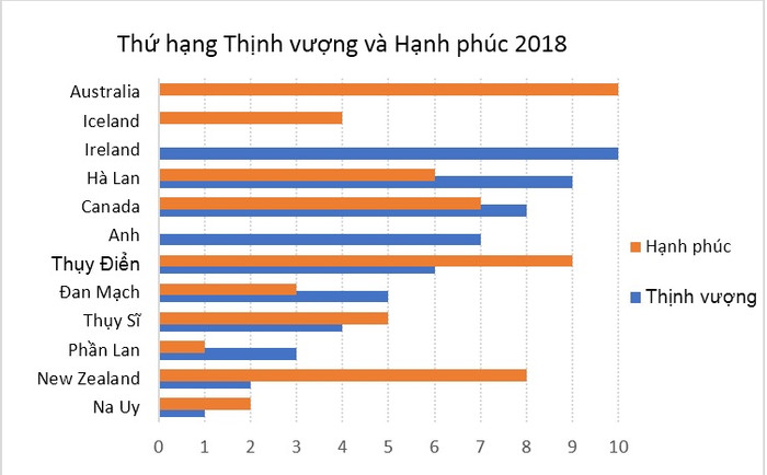 Mặt khác, trong 10 nước đứng đầu danh sách quốc gia hạnh phúc nói trên, chỉ 3 quốc gia có ngôn ngữ chính thức là tiếng Anh (Canada, New Zealand và Australia).