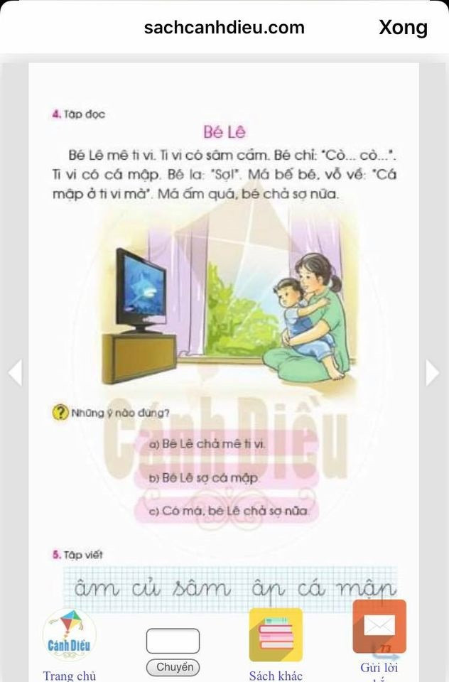 Bài “Bé Lê” (trang 73): “Bé Lê mê ti vi. Ti vi có sâm cầm. Bé chỉ: “Cò… cò…”. Ti vi có cá mập. Bé la: “Sợ!”. Má bế bé, vỗ về: “Cá mập ở ti vi mà”. Má ấm quá, bé chả sợ nữa”.