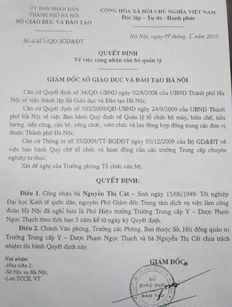 Được biết, ngày 3/6/2011, UBND TP. Hà Nội chính thức có công văn số 1943/VP-VHKG gửi tới Sở Nội vụ với nội dung: “Đồng chí Nguyễn Thị Bích Ngọc, Phó Chủ tịch UBND TP. Hà Nội có ý kiến như sau: Giao Sở Nội vụ xem xét giải quyết, trả lời bà Nguyễn Thị Cát theo quy định, báo cáo kết quả với UBND Thành phố”.