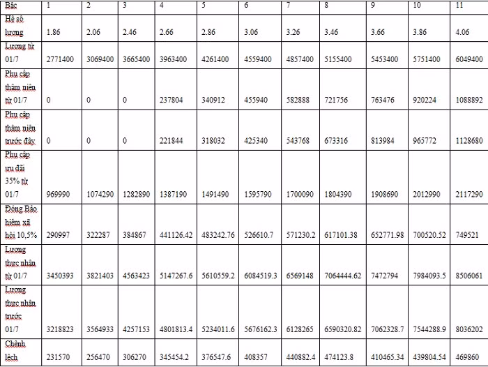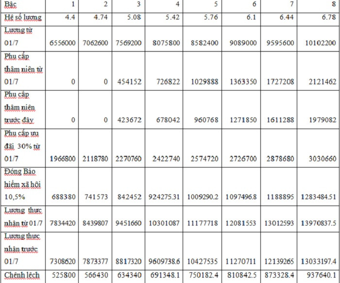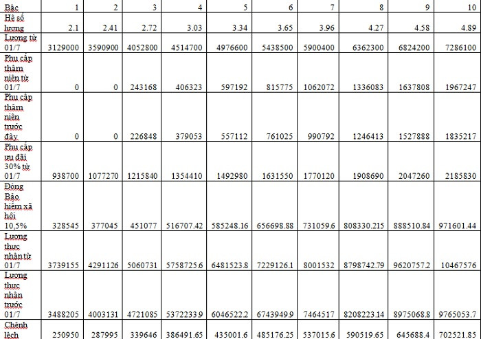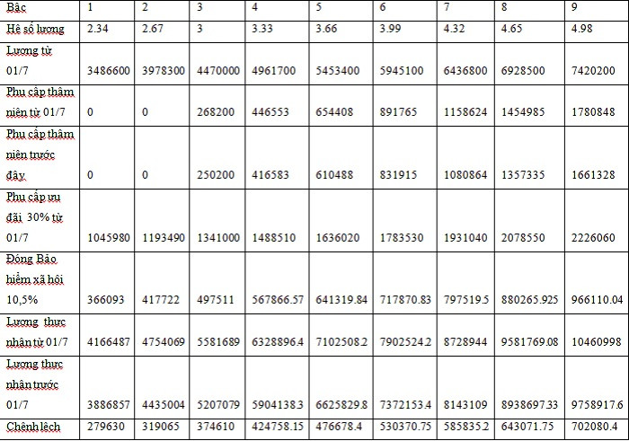 Bảng lương trên có tính chất tham khảo, còn tùy thuộc thời gian giữ ngạch, thời gian chuyển ngạch, nâng lương và phụ cấp thâm niên hiện hưởng.