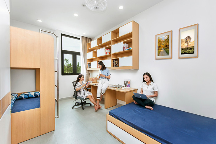 Khu kí túc xá hiện đại như một chung cư cao cấp này có đầy đủ tiện ích như căng tin, phòng y tế, khu tự học, các cửa hàng tiện ích và không gian thư giãn sau giờ học.