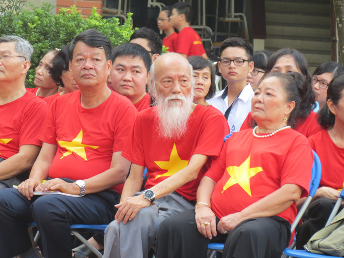 Trước khi vào bài phát biểu, thầy Văn Như Cương đề nghị tất cả thầy cô và học sinh "Hãy giơ tay lên cao và đặt nó lên ngực trái của mình, nơi trái tim mình đang đập...".