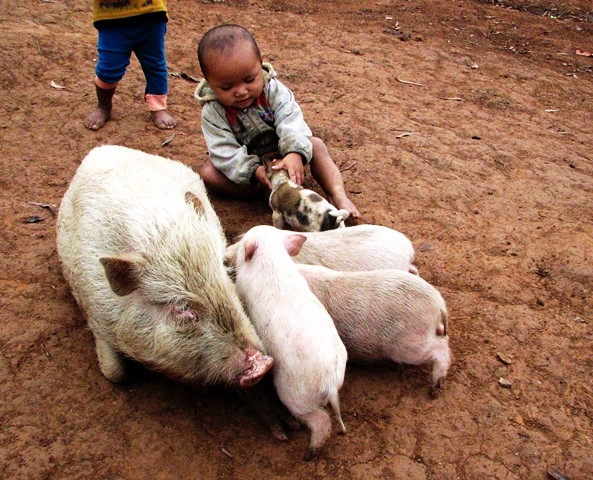 | Một em nhỏ không mặc quần ngội bệt dưới đất chơi với các con vật (Ảnh: Thủy Phan) |