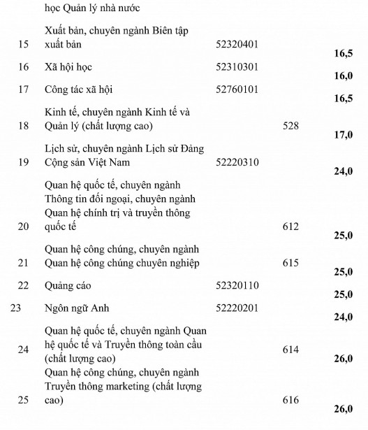 - Ngành Quan hệ quốc tế, Quan hệ công chúng, Quảng cáo, Ngôn ngữ Anh: môn Tiếng Anh tính hệ số 2.