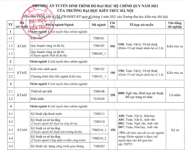 Chi tiết phương án tuyển sinh năm 2021 của Trường Đại học Kiến trúc Hà Nội, như sau: