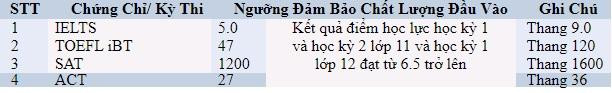 - Đối tượng 2: Thí sinh có kết quả ở các kỳ thi tiếng Anh quốc tế, đánh giá năng lực quốc tế; Các chứng chỉ và ngưỡng điểm cụ thể như sau: