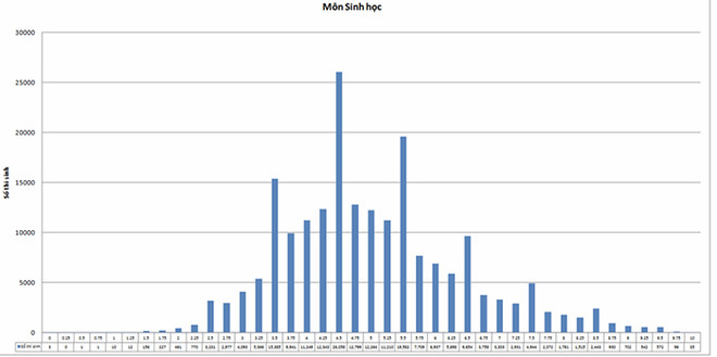 Các môn khác thì phổ điểm có khá nhiều biểu hiện dường như "giật cục" - lên xuống nhiều, lượn sóng chứ không còn mang dáng dấp chuẩn là hình quả chuông úp ngược nữa (đồ thị hình quả chuông úp ngược thể hiện quy luật là với mỗi môn thi, sẽ có một số ít em rất kém, một số ít em kém, một số em giỏi, một số ít em rất giỏi, còn lại thì tập trung ở khúc giữa là trung bình-khá.