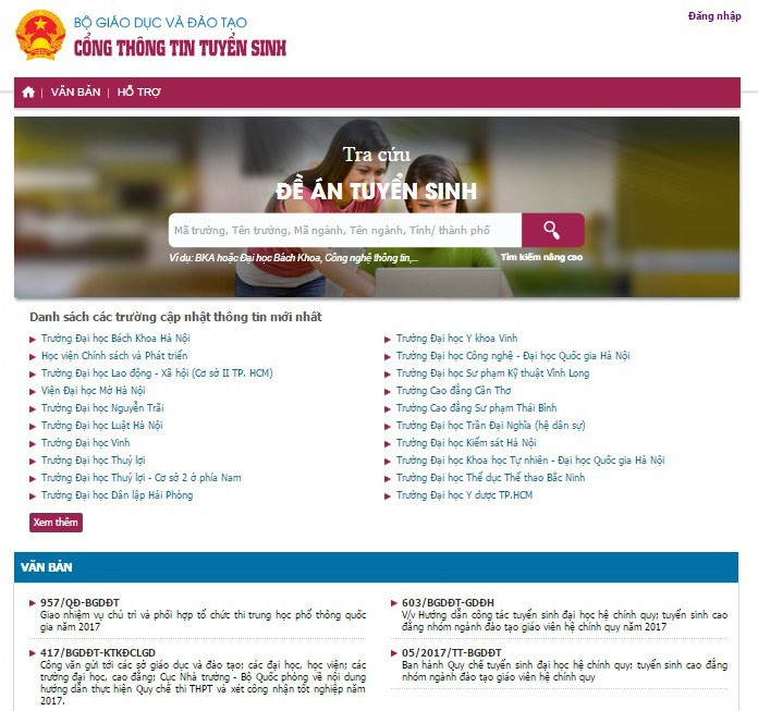 Cổng thông tin tuyển sinh của Bộ Giáo dục và Đào tạo tích hợp các thông tin liên quan đến công tác chỉ đạo điều hành, cơ sở dữ liệu về kết quả kỳ thi quốc gia, đề án tuyển sinh và điều kiện xét tuyển của các trường, hệ thống nhập dữ liệu thống kê nguyện vọng của thí sinh.
