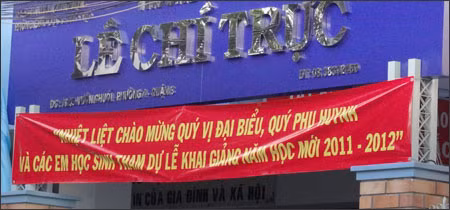 Nhưng không hiểu sao ngành GD-ĐT lại cẩn thận đến mức hướng dẫn luôn cả cách treo băng-rôn và cách viết khẩu hiệu trong ngày lễ của thầy và trò này. “Văn mẫu” mà ngành GD-ĐT TP yêu cầu đó là thủ trưởng các đơn vị phải nghiêm túc thực hiện gồm: băng-rôn ở cổng trường có dòng chữ “Nhiệt liệt chào mừng quý vị đại biểu, quý vị phụ huynh và các em học sinh tham dự lễ khai giảng năm học mới 2011 - 2012” (ảnh);