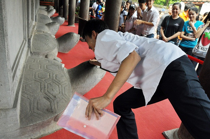 Càng gần những ngày thi đại học, lượng sĩ tử và phụ huynh lại ùn ùn đổ về Văn Miếu để cầu may. Không chỉ là những sĩ tử ở Hà Nội mà còn có hàng nghìn các sĩ tử từ nhiều tỉnh thành khác đổ về Hà Nội.