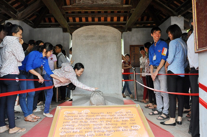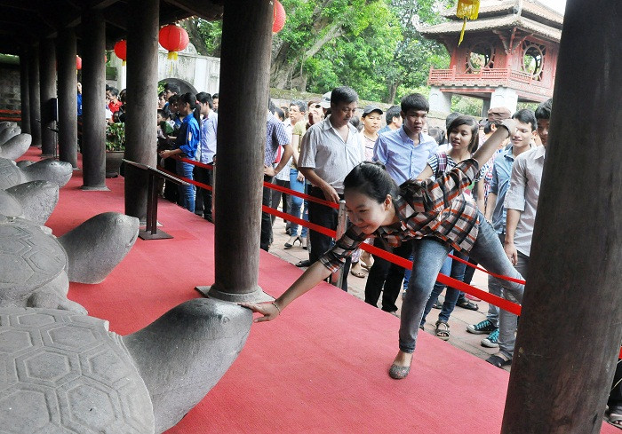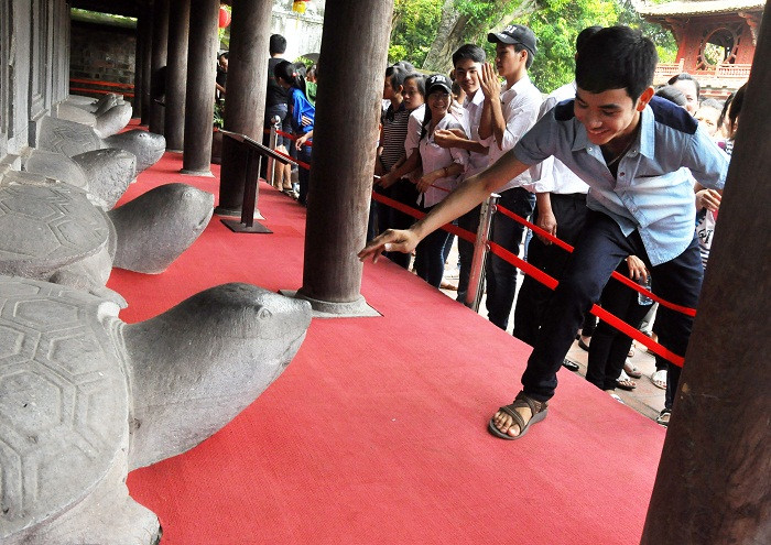 "Cuộc chiến" trống lại việc sờ đầu rùa của sĩ tử và người nhà diễn ra rất khó khăn: “Chúng mình không thể kiểm soát hết được. Ngăn được người này thì người kia đã sờ vào đầu rùa rồi” – Bạn Hiền (sinh viên tình nguyện) chia sẻ.