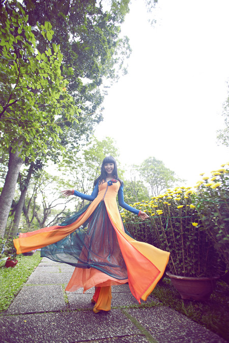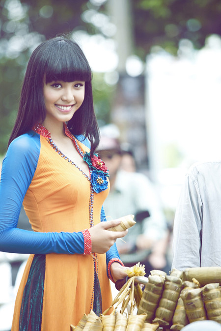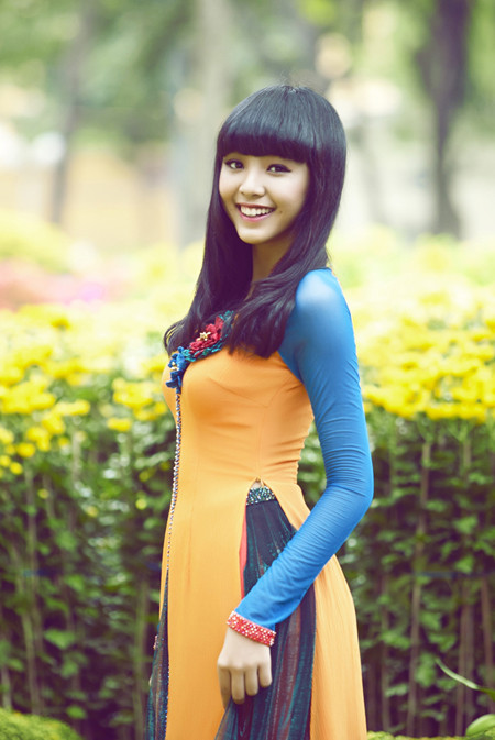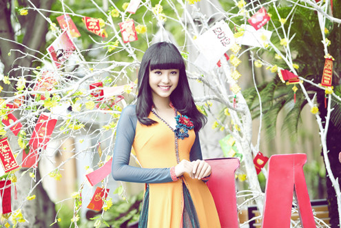 Trong bộ ảnh áo dài dạo phố đầu xuân, Bảo Trân trông già hơn nhiều so với tuổi 14 của mình.