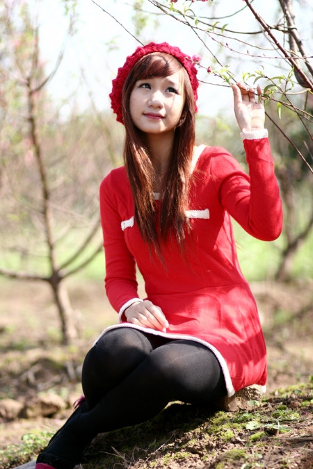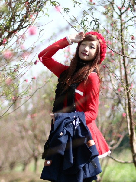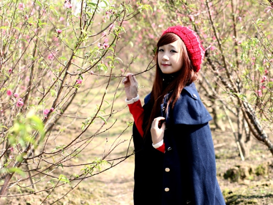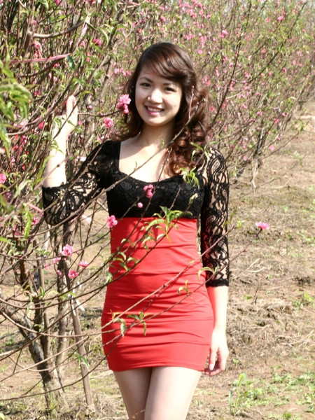 | Bên những bông đào, thiếu nữ khoe nét xuân xanh duyên dáng. |
