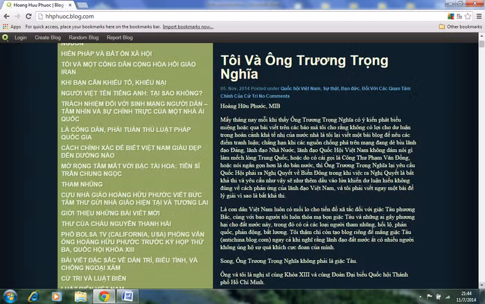 MIB HHP viết: “Mấy tháng nay mỗi khi thấy Ông Trương Trọng Nghĩa có ý kiến phát biểu miệng hoặc qua bài viết trên các báo mà tôi cho rằng không có lợi cho dư luận trong hoàn cảnh khá tế nhị của nước nhà là tôi lại viết một bài blog để nêu các điểm tranh luận; chẳng hạn khi các nguồn chống phá trên mạng đang dè bỉu lãnh đạo Đảng, lãnh đạo Nhà Nước, lãnh đạo Quốc Hội Việt Nam không dám nói gì làm mếch lòng Trung Quốc…”.
