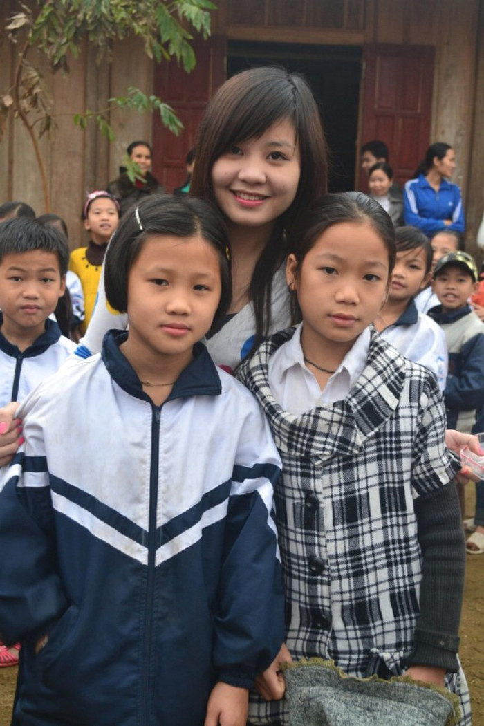 | Minh Khuê và Thúy Hiền (đứng sau), 2 nữ sinh đã tham dự cuộc thi ảnh Tìm kiếm Gương mặt Nữ sinh trong mơ 2013, đó chính là cầu nối cho họ đến với chương trình từ thiện này. |