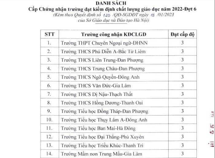| Danh sách các trường được cấp chứng nhận trường đạt kiểm định chất lượng giáo dục năm 2022 đợt 6 |