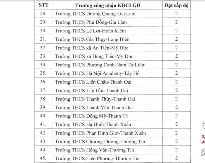 Công nhận 45 trường đạt cấp độ 2, trong đó có 10 trường mầm non, 10 trường tiểu học, 22 trường trung học cơ sở, 03 trường trung học phổ thông;