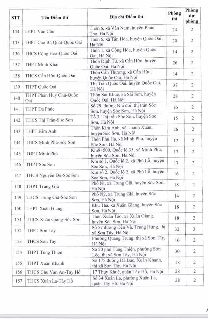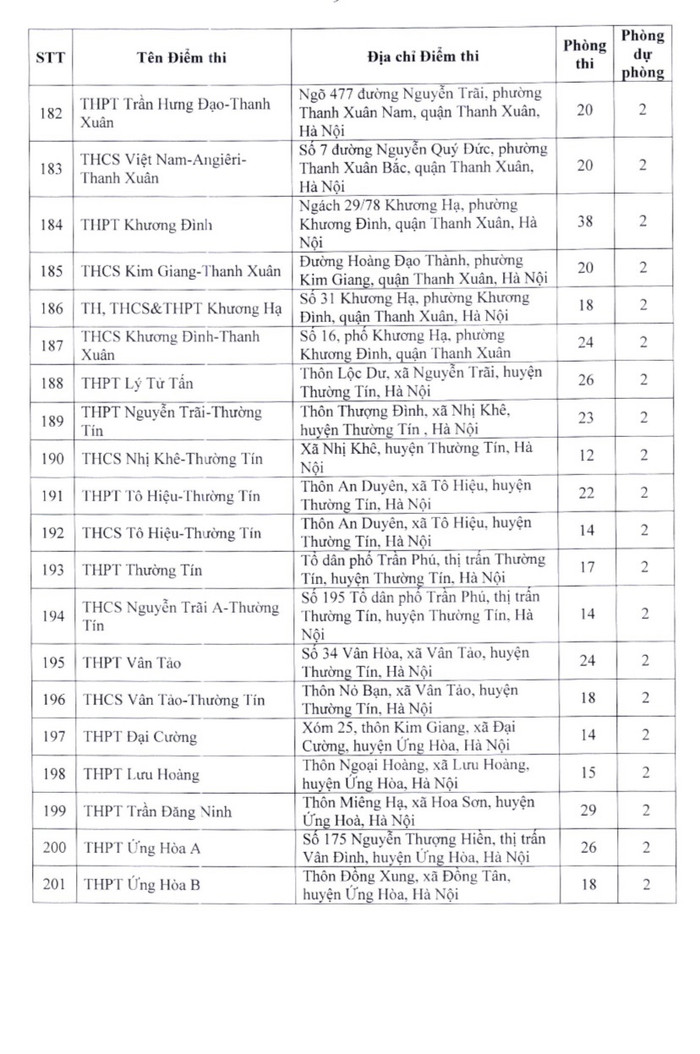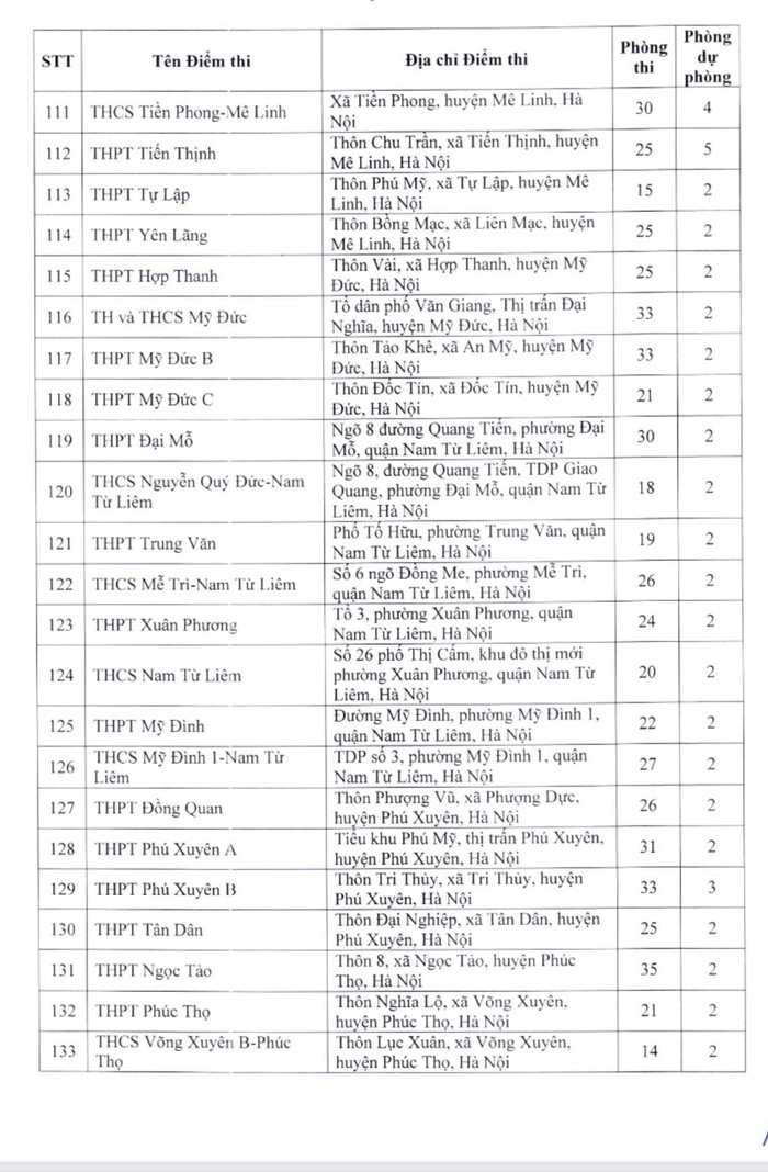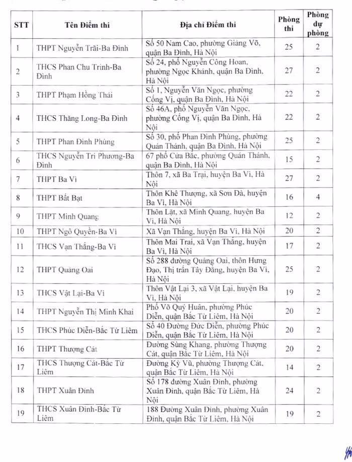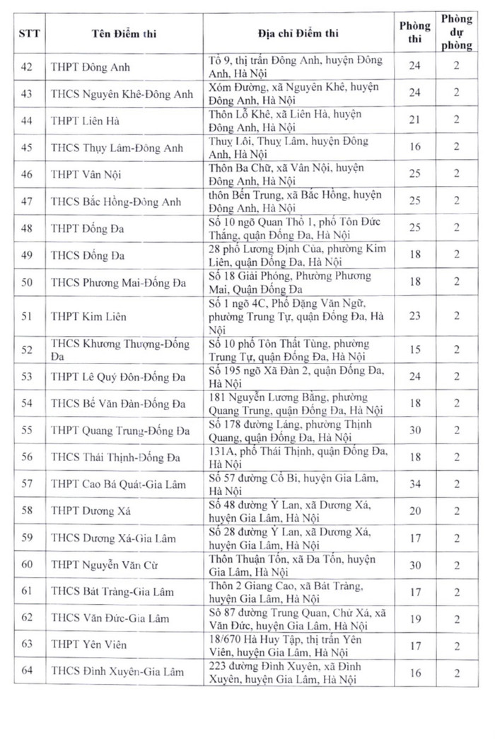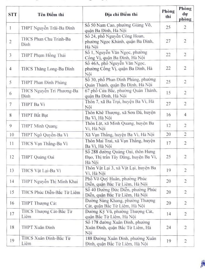 Một số điểm thi có nhiều phòng thi như: Trung học phổ thông Nguyễn Du - Thanh Oai có 40 phòng thi; Trung học phổ thông Xuân Mai có 39 phòng thi; Trung học phổ thông Khương Đình có 38 phòng thi; Trung học phổ thông Chúc Động có 38 phòng thi, Trung học phổ thông Cao Bá Quát – Gia Lâm có 34 phòng thi...