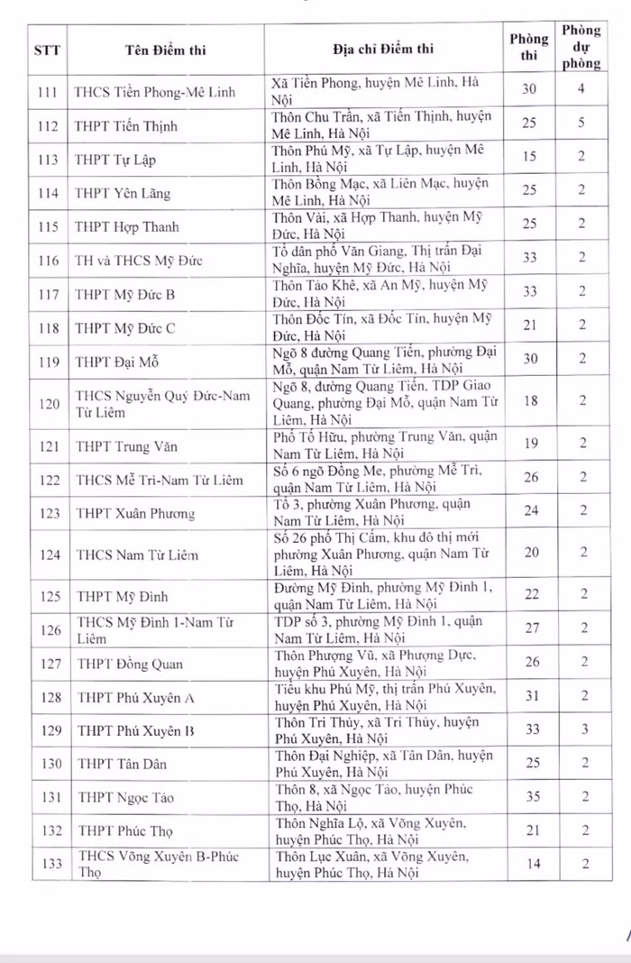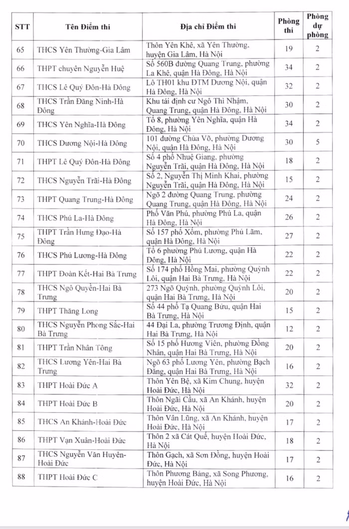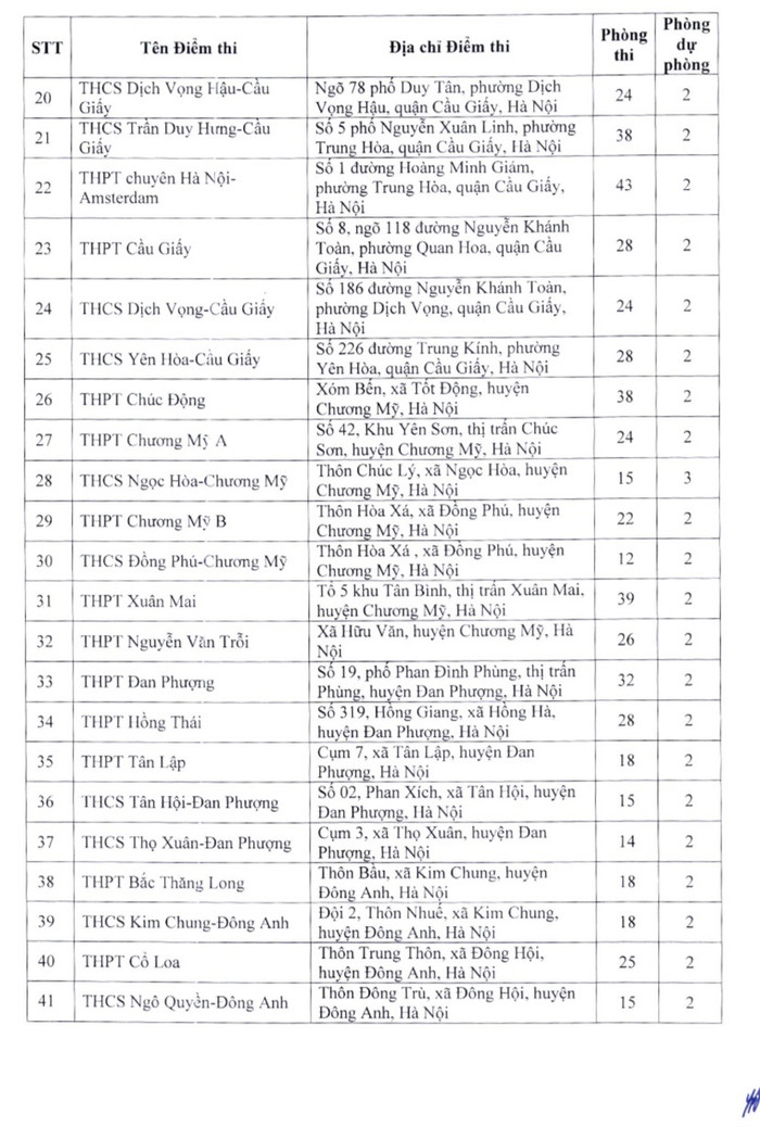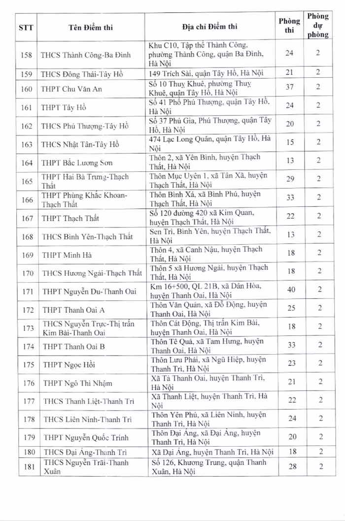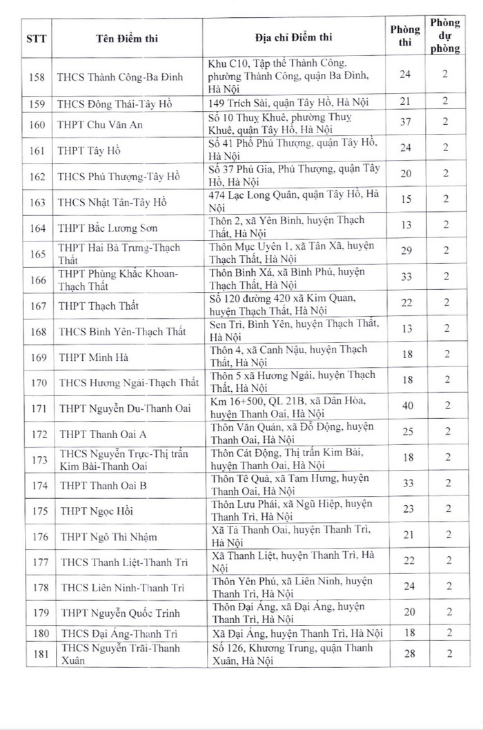 Một số điểm thi có nhiều phòng thi như: Trung học phổ thông Nguyễn Du - Thanh Oai có 40 phòng thi; Trung học phổ thông Xuân Mai có 39 phòng thi; Trung học phổ thông Khương Đình có 38 phòng thi; Trung học phổ thông Chúc Động có 38 phòng thi, Trung học phổ thông Cao Bá Quát – Gia Lâm có 34 phòng thi...