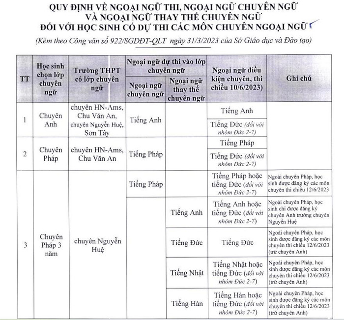 Sở Giáo dục và Đào tạo Hà Nội quy định rõ về môn thi ngoại ngữ khi đăng ký dự thi vào các lớp chuyên ngữ như sau: