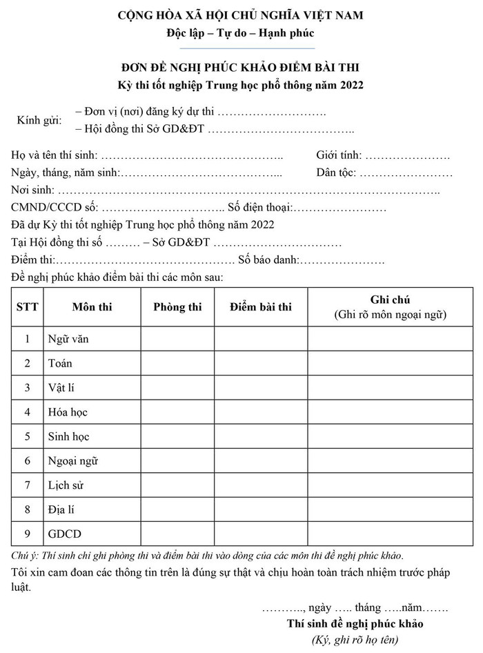 Mẫu đơn phúc khảo bài thi tốt nghiệp trung học phổ thông năm 2022: