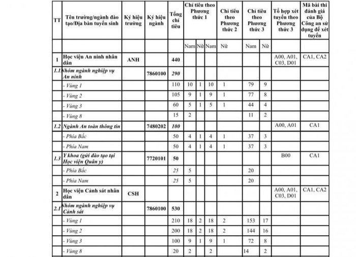 Tuyển sinh khu vực phía Bắc với: Học viện Cảnh sát nhân dân; các ngành còn lại của Học viện An ninh nhân dân.