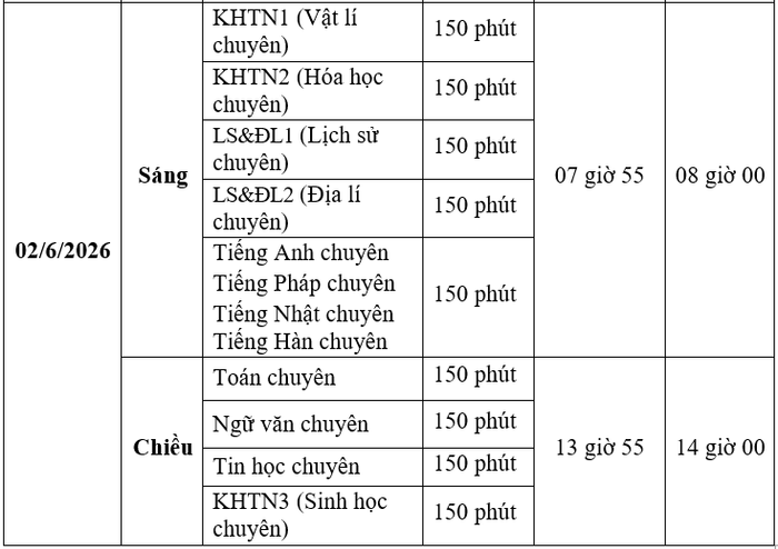 Bên cạnh thi các môn như lịch thi vào lớp 10 trung học phổ thông công lập không chuyên, thí sinh thi các môn chuyên sẽ làm thêm bài thi vào ngày 2/6/2026. Cụ thể như sau: