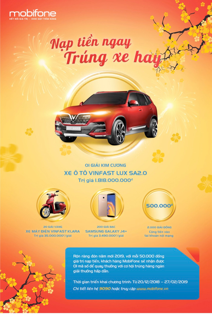 | Chương trình “Nạp tiền ngay trúng xe hay” của MobiFone áp dung từ 20/12/2018 đến 27/02/2019 với các giải thưởng như sau: