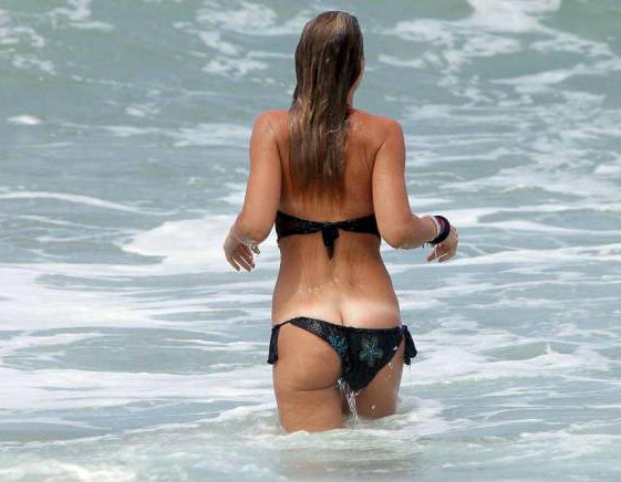 | Bất ngờ một con sóng mạnh khiến chiếc quần bơi của cô bị tụt xuống, phơi bày một phần vòng ba của cô |