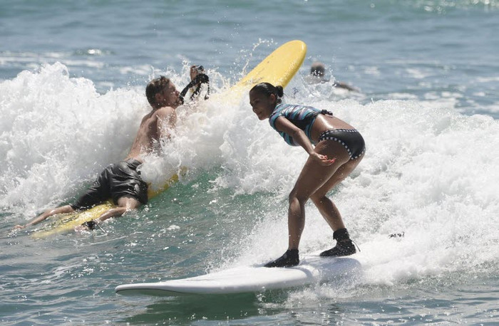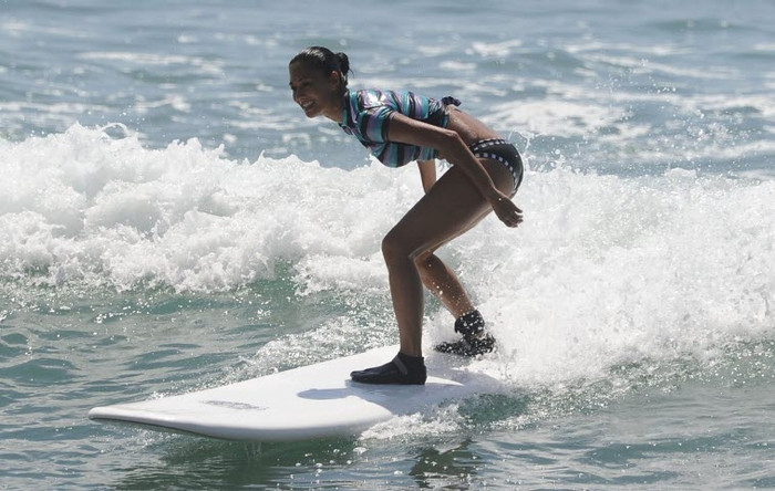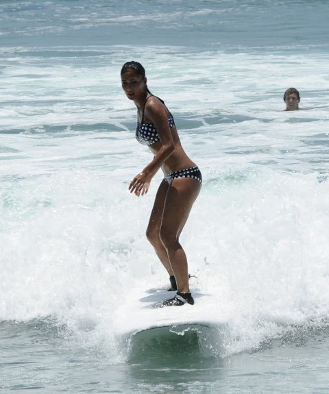 | Ca sĩ Nicole Scherzinger nhí nhảnh tạo dáng chụp ảnh khi tham gia lướt ván tại Cabo San Lucas, Mexico. |