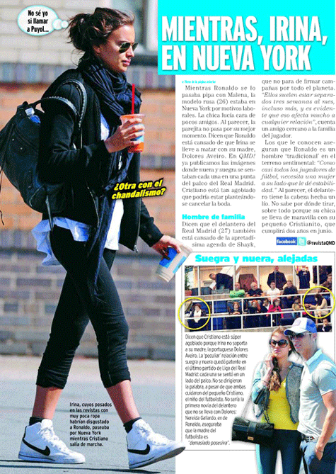 Sau khi đăng ảnh và đặt nghi vấn chuyện tình cảm giữa chàng siêu sao bảnh bao và người đẹp Malena Costa, tờ QMD còn đưa ảnh Irina Shayl, bạn gái của C. Ronaldo, cô đơn đi dạo tại New York đi kèm phán đoán rằng chàng tiền vệ cánh và siêu mẫu Nga đã chia tay.
