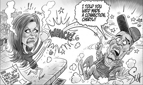 Ngay lập tức, Cheryl lên tiếng khẳng định MC Harvey là một kẻ bịp bợm. Trên trang mạng Twitter, cô ca sĩ xinh đẹp 28 tuổi người Anh cho biết, cô mới gặp MC Harvey đâu có 1 hoặc 2 lần ở những nơi công cộng cùng với Alesha Dixon. Thanh minh xong, Cheryl mới chửi mát mẻ tay rapper ba que, xỏ lá kia rằng: “Tôi thì có quan hệ quái gì với anh. Có vấn đề gì trong đầu của anh hay anh lại hút thứ gì tầm bậy?”. Không phải tay vừa, MC Harvey “phản pháo” ngay, cũng trên trang mạng Twitter rằng: “Cô có cần tôi công bố những email cô gửi cho tôi không? Nếu tôi công bố, người ta sẽ ném trứng thối vào mặt cô đấy!”.