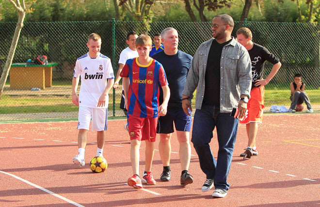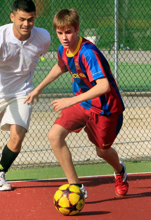 | Tháng 4/2011, Justin Bieber có chuyến thăm Tây Ban Nha. Tại thị trấn nhỏ Alcalá de Henares, ca sĩ trẻ người Canada có trận bóng giao hữu. Anh quyết định mặc bộ áo đấu của Barcelona để “nghênh đón” các đối thủ mặc áo trắng, một số trong đó là áo đấu của Real Madrid. |