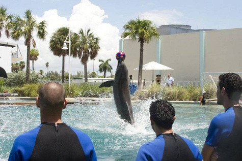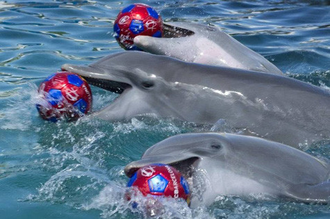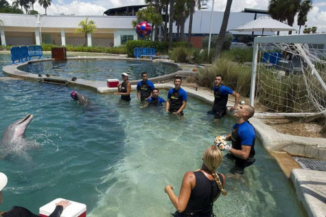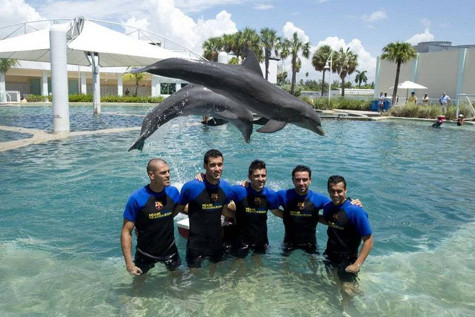 | Các sao Barca cùng nhau chơi bóng nước trong bể với sự có mặt của những chú cá heo và một người đẹp tóc vàng. |