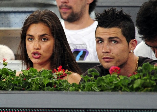 | Cristiano Ronaldo và bạn gái Irina Shayk ngồi ở khu vực khán đài VIP được trang trí hoa tươi và hàng rào sắt bảo vệ. |