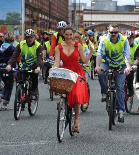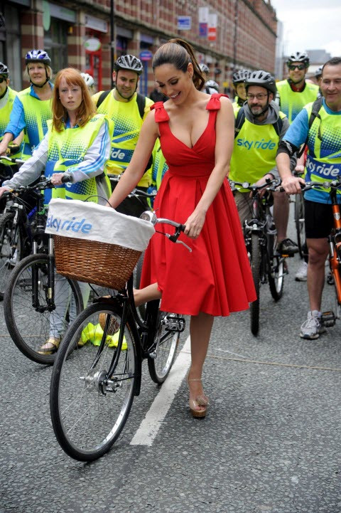 | Kelly Brook rạng ngời trong chiếc váy đỏ dẫn đầu đoàn đạp xe quanh thành phố Manchester , để cô vũ mọi người đạp xe bảo vệ môi trường |