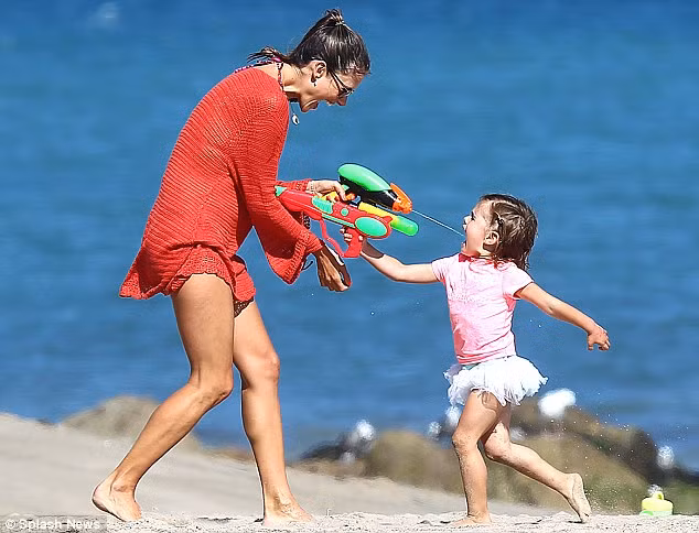 | Siêu mẫu Alessandra Ambrosio đã có buổi vui đùa cùng con gái nhỏ Anja Louise Ambrosio Mazur rất thoải mái trên bãi biển Los Angeles, California. |